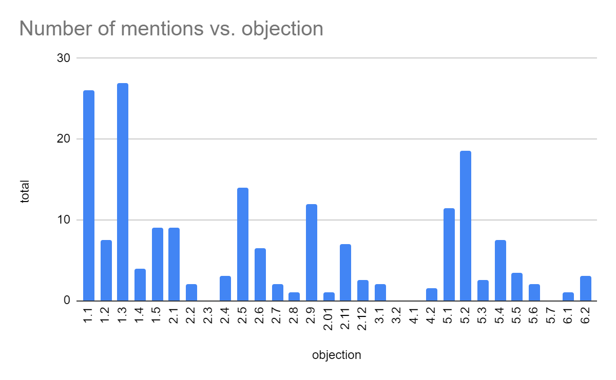 Using a taxonomy from AI Risk Skepticism, I clustered objections into categories. The most common objections were: