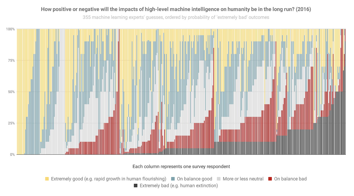 What do AI researchers expect: https://www.lesswrong.com/posts/Zq2HaihaDy7sSarMz/how-bad-a-future-do-ml-researchers-expect