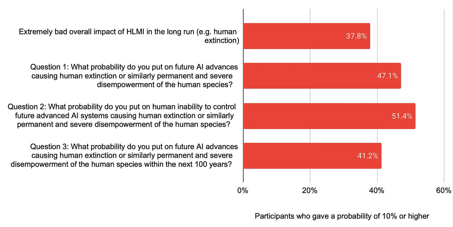 According to AI Impacts, ~40-50% of respondents indicated a >10% chance of catastrophic outcomes from AI progress.