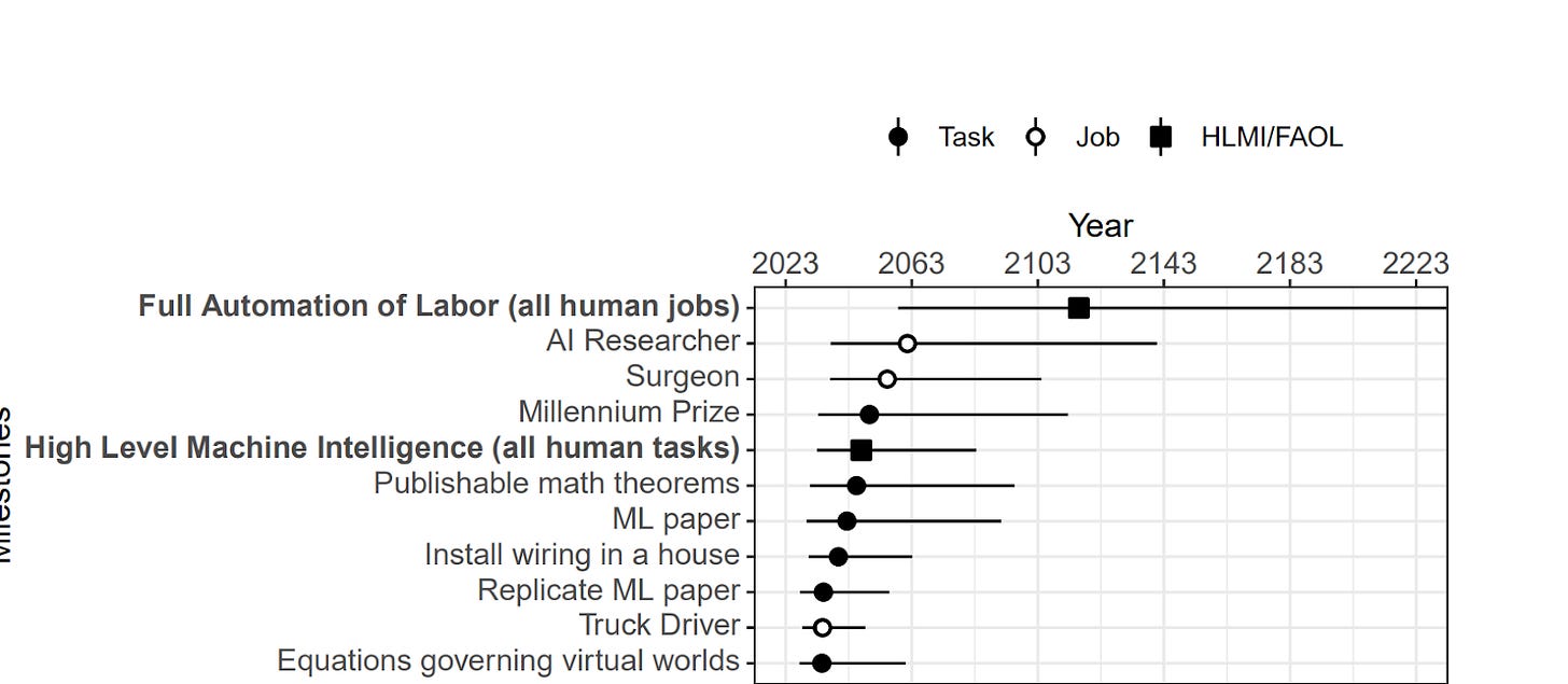 I’m surprised by this result. The median AI researcher actually thinks that there will be an entire 69 years between a machine capable of all human jobs and full automation of labor? Is it really plausible that we build AI systems with human-level cognitive abilities, and business just continues as usual for an entire 69 years? This does not make sense to me and I don’t think these researchers have been thinking hard about their responses to these questions.